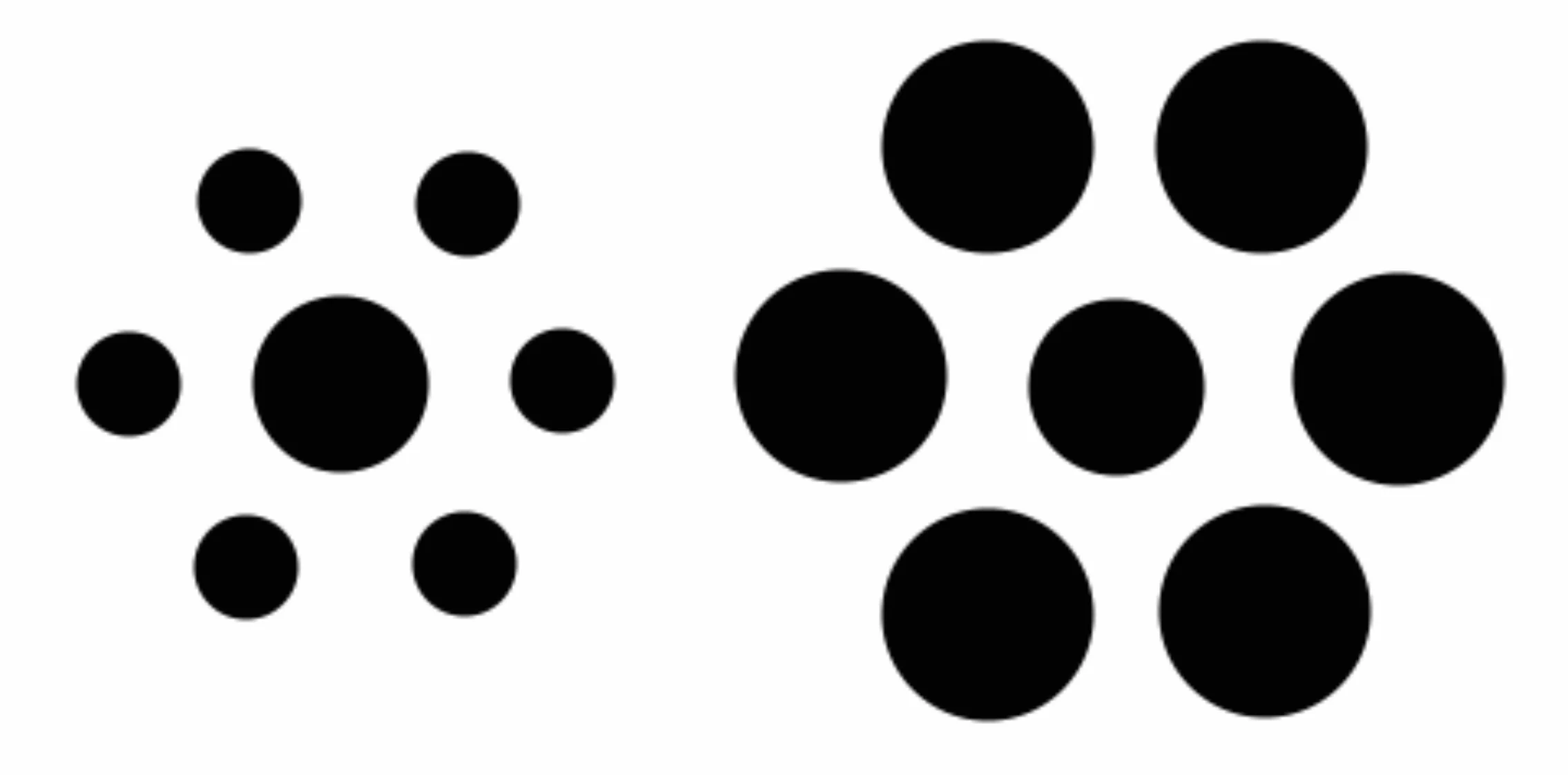 Beginnen möchte ich mit dem Kontrasteffekt. Er besagt, dass wir einen Faktor als besonders auffällig wahrnehmen, wenn er im Kontext mit einem weniger ausgeprägten Faktor steht. Ein ganz bekanntes Beispiel ist die Wahrnehmung der mittleren Kreise im folgenden Bild: